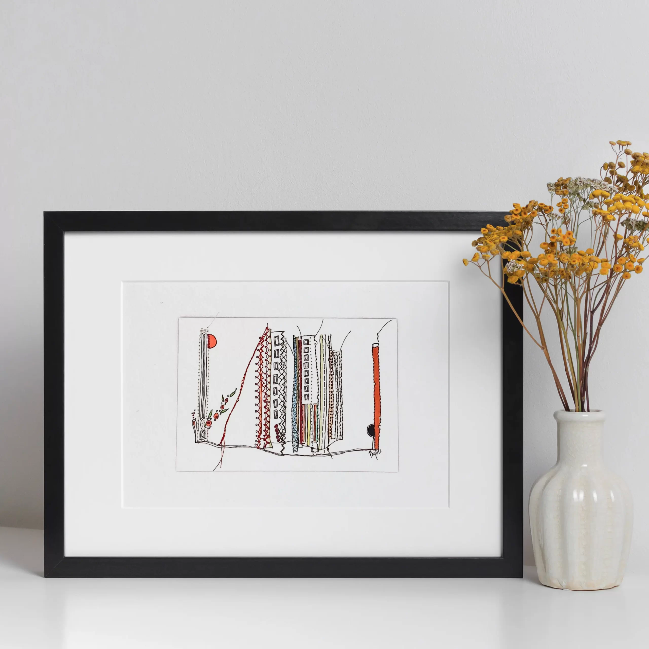 Création sur papier dessiné et cousu, un travail en plusieurs étapes de part les finitions, détails . Travail miniature. Ce qui donne avec ses couleurs un effet étonnant et le relief de la couture. Suivant sa complexité de coudre avec plusieurs fils de couleur