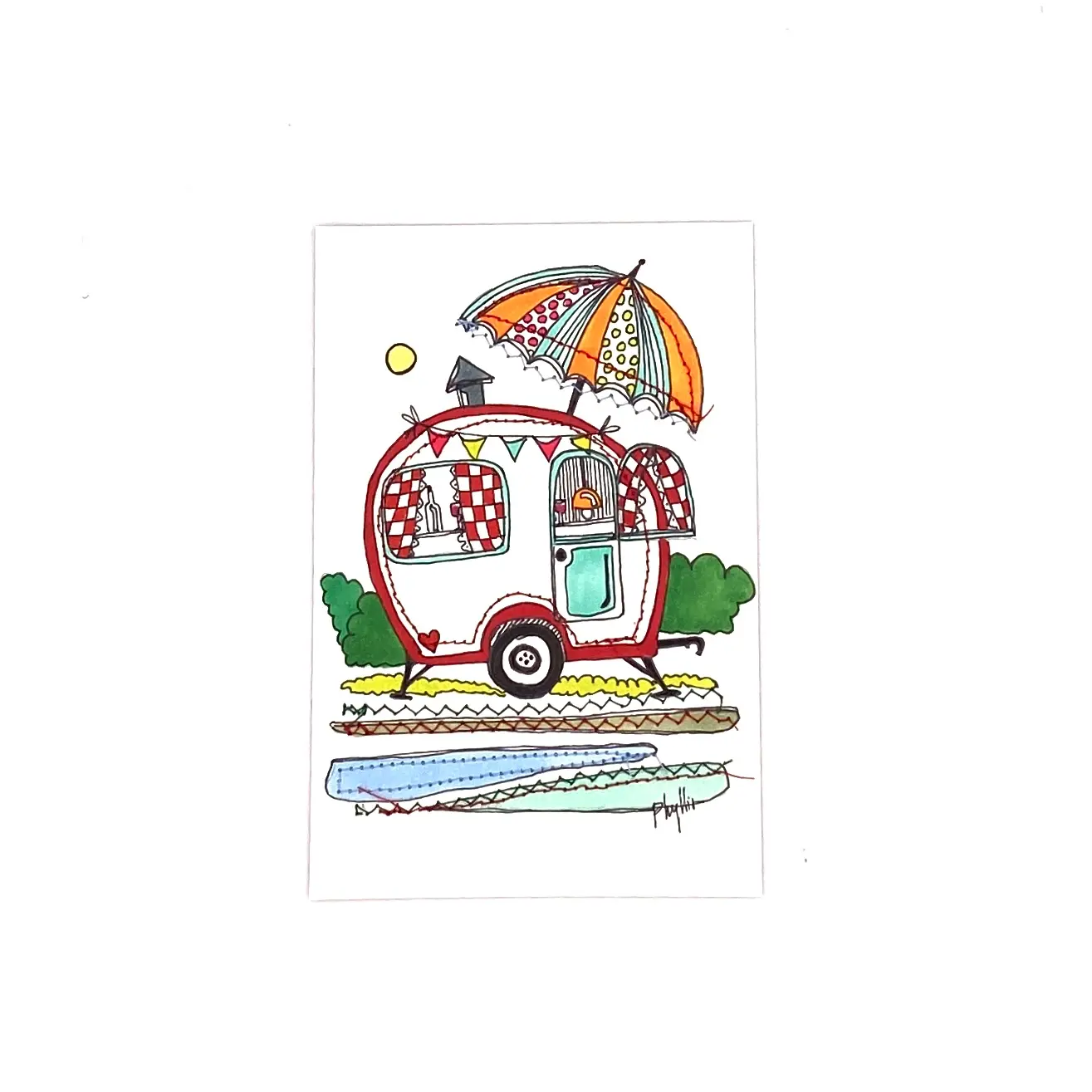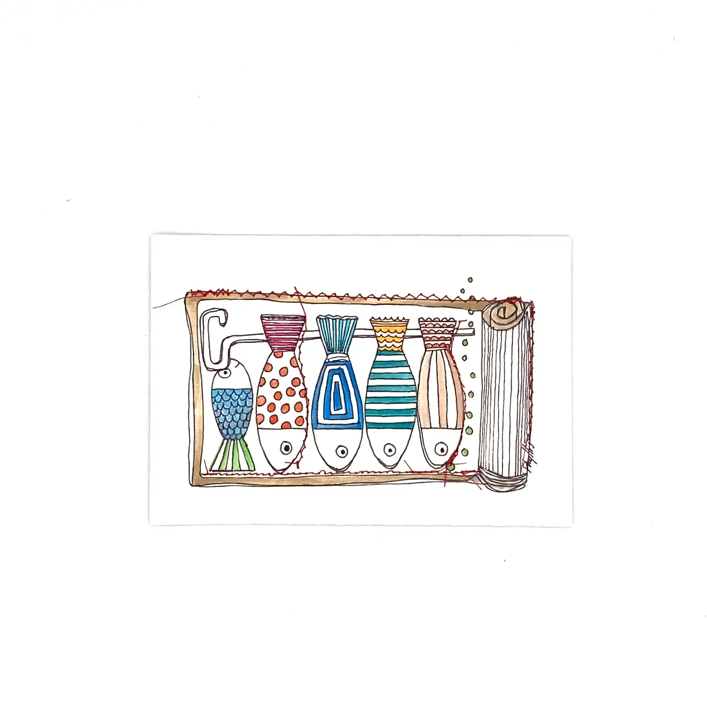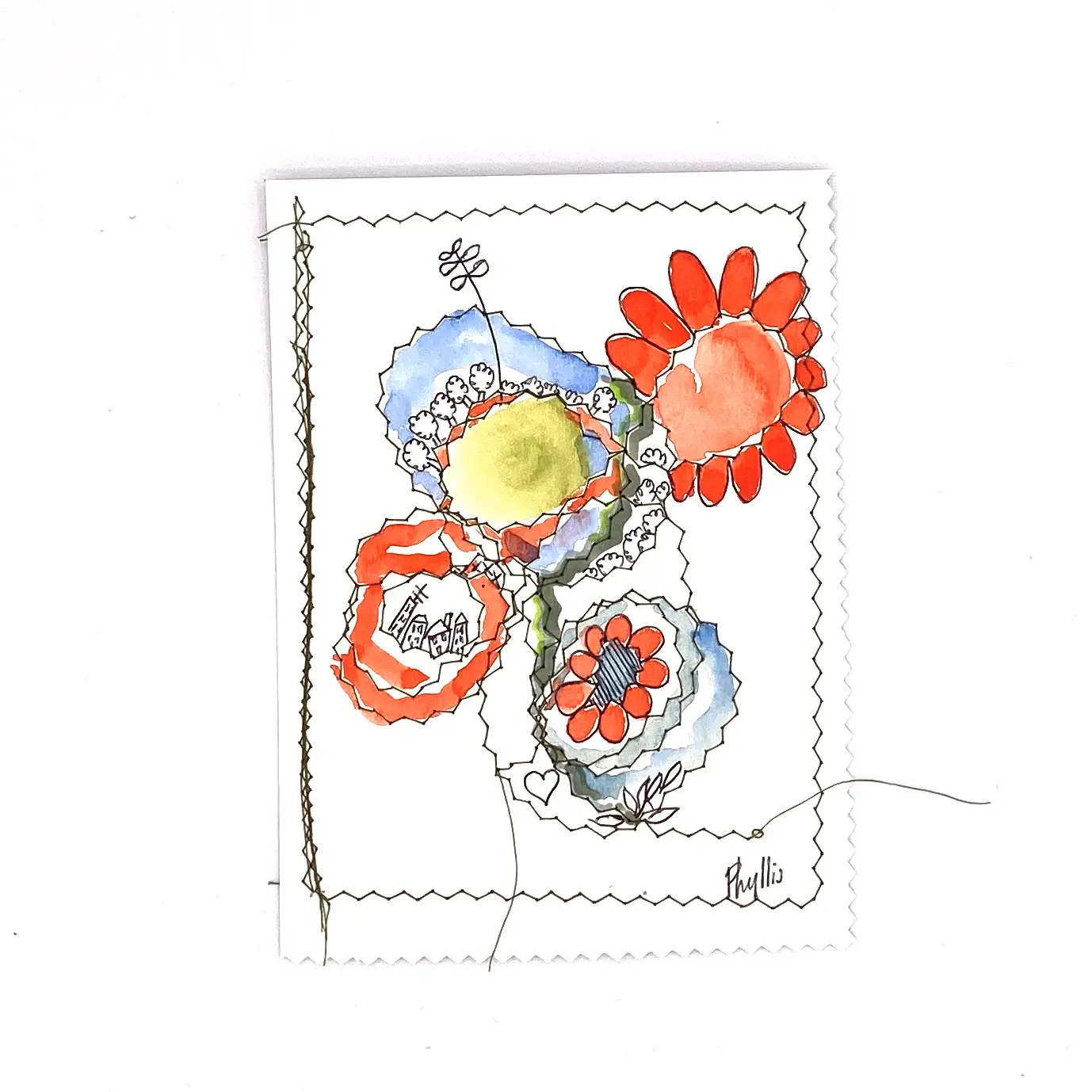 Papier texturé, 250gr avec aquarelle, feutres acryliques et couture