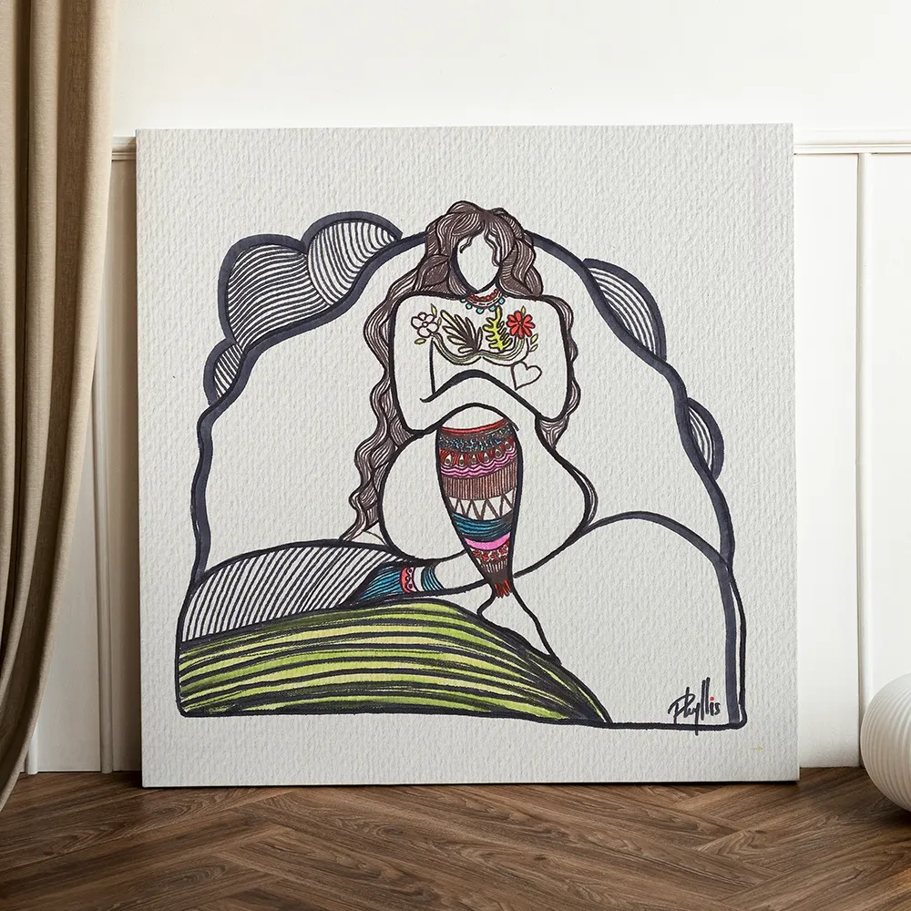 Réalisation avec des marqueurs acryliques, travaillé en direct, la texture de la toile donne un grain. Le tableau prend vie avec ses tons et formes. une escapade pour l’imagination.