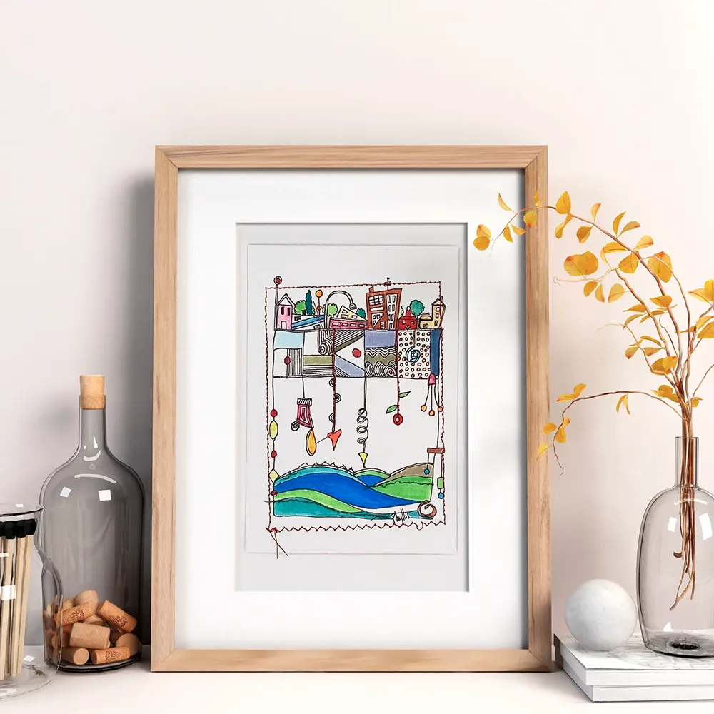 Création sur papier dessiné et cousu, un travail en plusieurs étapes de part les finitions, détails . Travail miniature. Ce qui donne avec ses couleurs un effet étonnant et le relief de la couture. Suivant sa complexité de coudre avec plusieurs fils de couleur