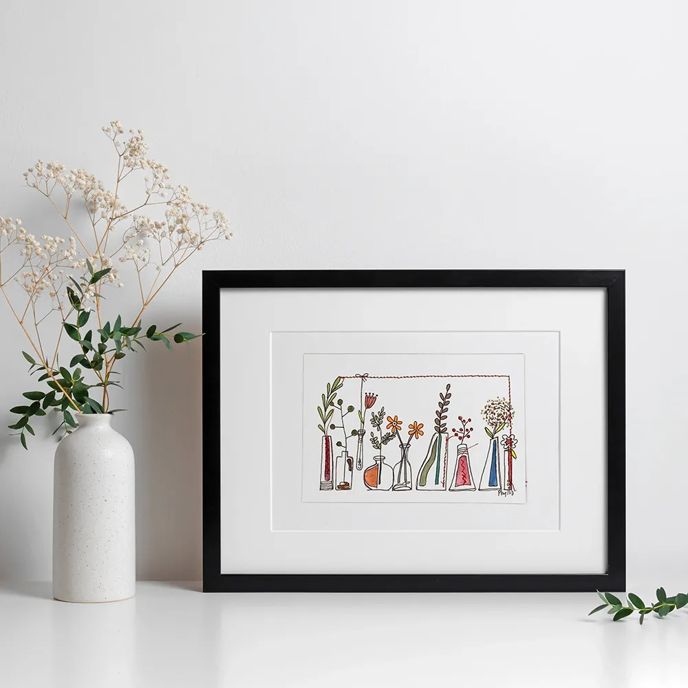 Création sur papier dessiné et cousu, un travail en plusieurs étapes de part les finitions, détails . Travail miniature. Ce qui donne avec ses couleurs un effet étonnant et le relief de la couture. Suivant sa complexité de coudre avec plusieurs fils de couleur
