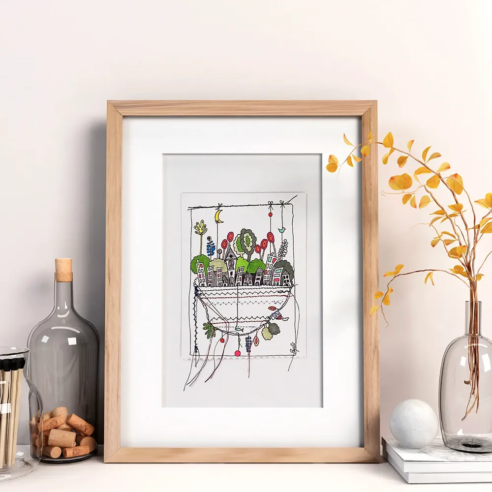 Création sur papier dessiné et cousu, un travail en plusieurs étapes de part les finitions, détails . Travail miniature. Ce qui donne avec ses couleurs un effet étonnant et le relief de la couture. Suivant sa complexité de coudre avec plusieurs fils de couleur