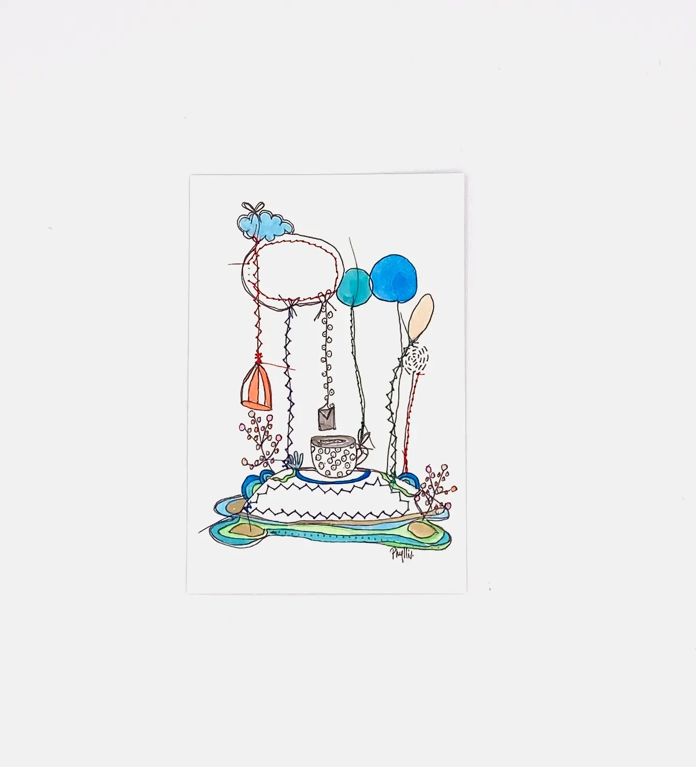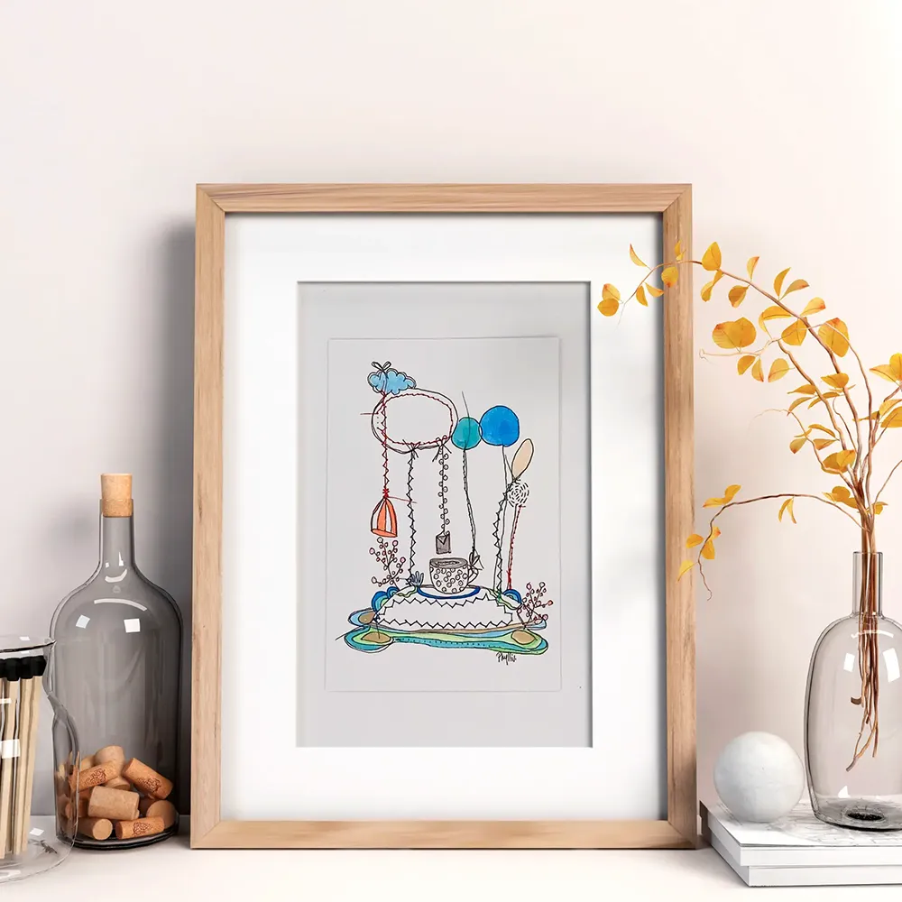 Création sur papier dessiné et cousu, un travail en plusieurs étapes de part les finitions, détails . Travail miniature. Ce qui donne avec ses couleurs un effet étonnant et le relief de la couture. Suivant sa complexité de coudre avec plusieurs fils de couleur